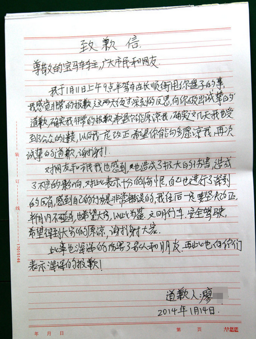 成都"車霸"被行車記錄儀拍下,現(xiàn)身寫道歉信