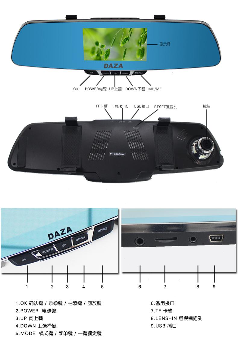 大智G822尺寸設(shè)計比較人性化,長度32厘米,寬度9.7厘米,機(jī)身最薄處可達(dá)10mm,能夠很好的覆蓋原車后視鏡,保持原車原貌,同時也為駕駛員提供了更寬闊的后視視野。鏡子部分采用專業(yè)級防眩目藍(lán)鏡,能有效防止行車中炫目,防止視覺疲勞,從而保障行車安全。正面下方有五個按鍵,從左到右依次是OK鍵、電源鍵、上翻鍵、下翻鍵、菜單鍵。頂端有四個接口,分別是備用接口、TF卡位、后接鏡頭插孔、USB插口。另外G822最高支持32GB存儲擴(kuò)展。