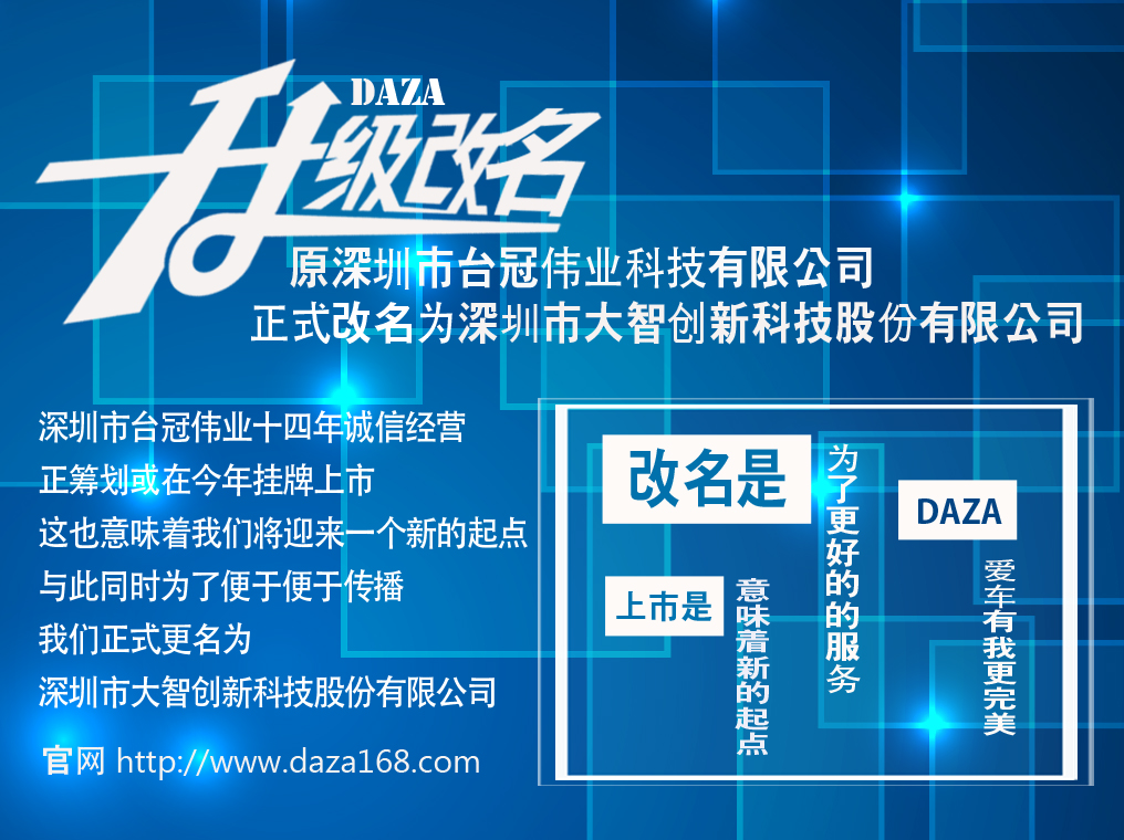 本公司正籌劃或今年將在新三板掛牌上市,這也意味著即將迎來一個新的起點、新的輝煌!自2002年以來,深圳市臺冠偉業(yè)十四年來誠信經(jīng)營,旗下的品牌“DAZA大智”,早已深入人心。為了便于社會各界的識別與傳播,于2016年4月1日,本公司也正式更名為“深圳市大智創(chuàng)新科技股份有限公司”。即日起,公司所有對內(nèi)外文件、公章等全部改用公司新稱。公司更名后,原法人代表、單位地址、郵編、聯(lián)系電話和傳真均不變。