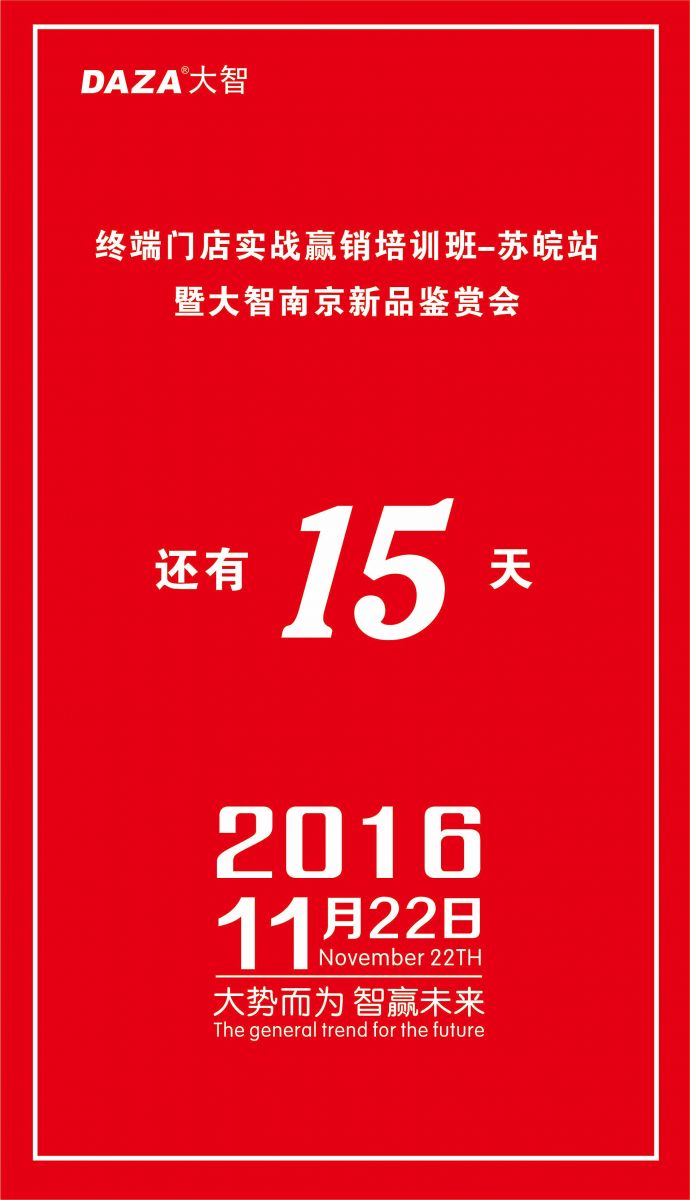 令人期待的終端門店實戰(zhàn)贏銷培訓(xùn)班-蘇皖站 暨大智南京新品鑒賞會,已經(jīng)進入了倒計時15天的階段!