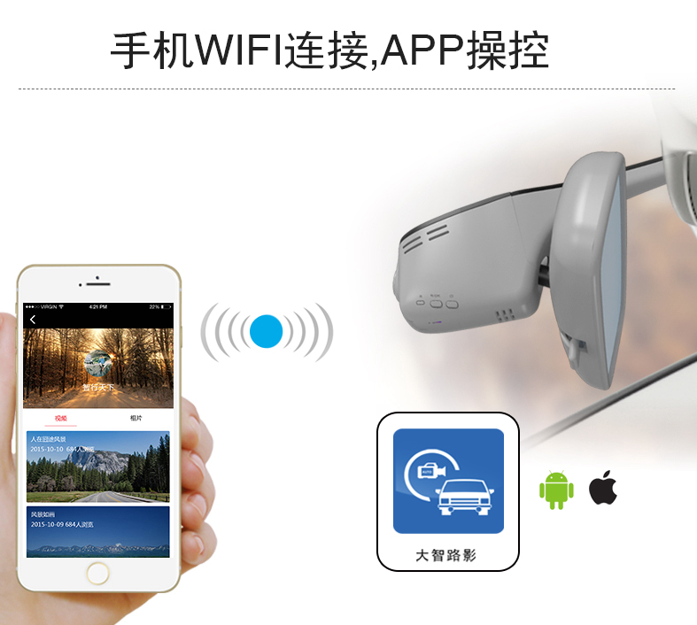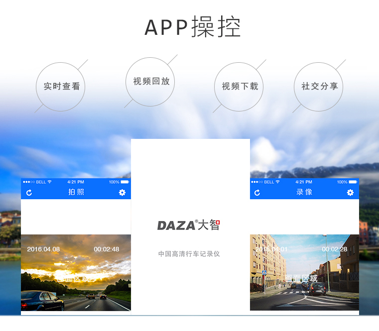 另外,大智專車專用行車記錄儀采用Wifi跟手機進行連接, 然后由手機APP控制,通過手機APP可以隨時隨地手機查看和操控拍照,操作簡單而方便。通過APP還能直接下載視頻和圖片,也可以分享到微信和微博等社交媒體上,將旅途的風光分享給更多朋友。