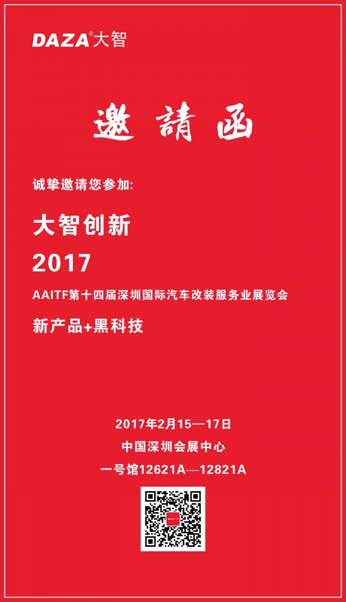 汽車后市場(chǎng)全產(chǎn)業(yè)鏈、全球性展貿(mào)平臺(tái),集新產(chǎn)品、新技術(shù)、新項(xiàng)目、新模式聚焦的行業(yè)盛會(huì)“第十四屆深圳國(guó)際汽車改裝服務(wù)業(yè)展覽會(huì)(簡(jiǎn)稱2017AAITF深圳春季展)”,于2017年2月15-17日在深圳會(huì)展中心將盛大舉行。作為汽車安全電子行車記錄儀行業(yè)首家掛牌的科技公司(股票代碼:839975),大智創(chuàng)新與您相約深圳會(huì)展中心,不見(jiàn)不散!